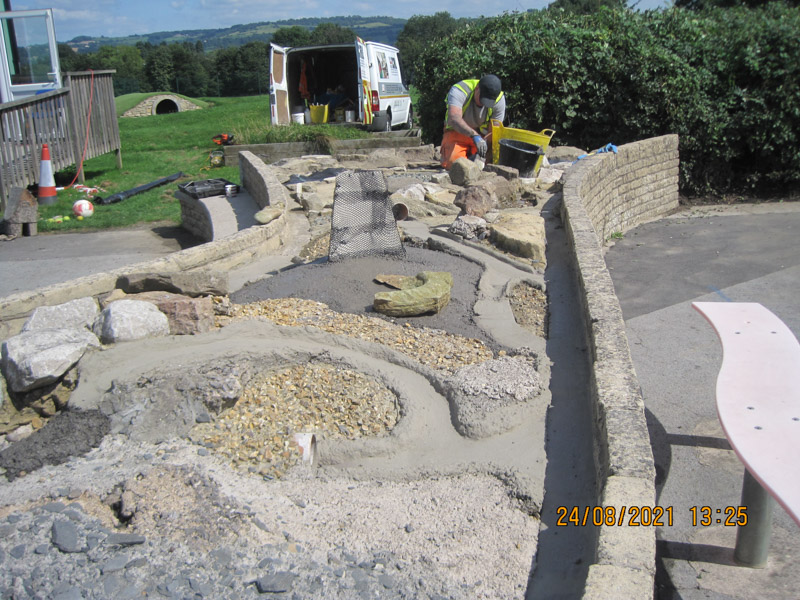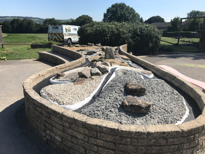 Some small ‘pocket’ areas were filled with loose stones in a variety of colours and some areas had small sparkly stones embedded in. One complete end was lined with black canvas and filled with loose play sand supplied by the school. Large stones surrounding this sanded area which had become loose were removed, cleaned and re-set.