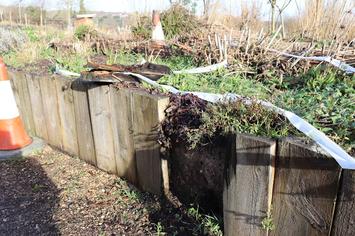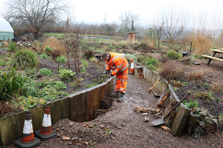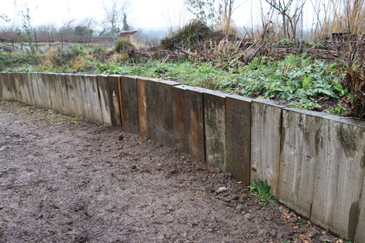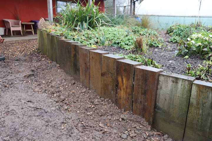We replaced and repaired sections of wooden retaining wall which were had become rotten and unstable. Having successfully restored the wall, it is now safe and strengthened to hold flower beds in place on either side of the path. Better still, we were able to use wooden sleepers that Flower Pod had collected but had not found use for (great to inject life back into spare timber!).